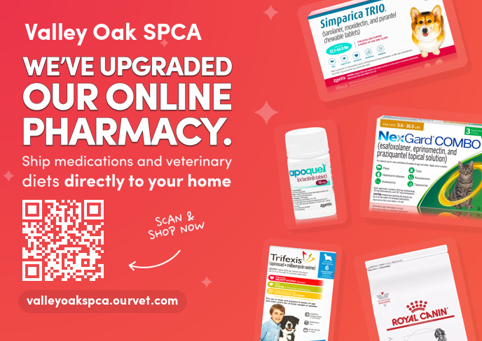 Valley Oak SPCA is proud to announce the launch of our new online pharmacy delivering straight to your home! We feel so lucky that you trust us to support your pet's health and happiness, and are excited to offer you an enjoyable online shopping experience for all your pet's preventative, medication, and diet needs.